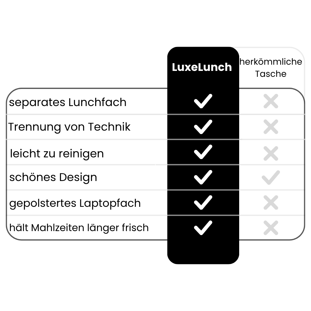LuxeLunch ist alltagstauglicher, sieht eleganter aus und bietet zusätzlich Stauraum für persönliche Gegenstände – ideal für Schule, Büro oder unterwegs.